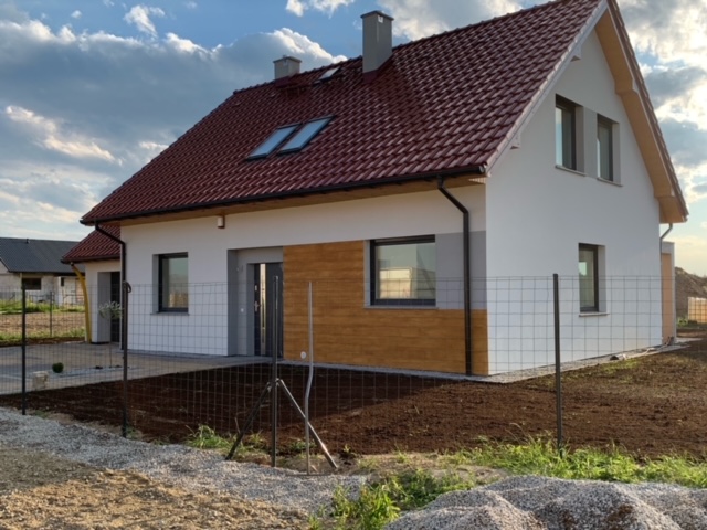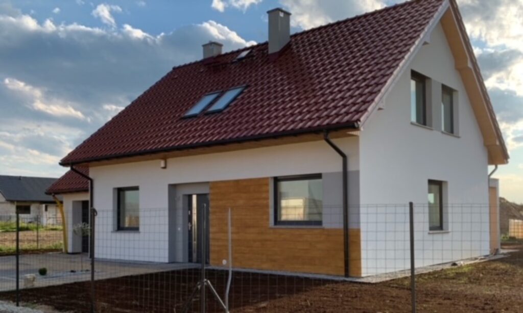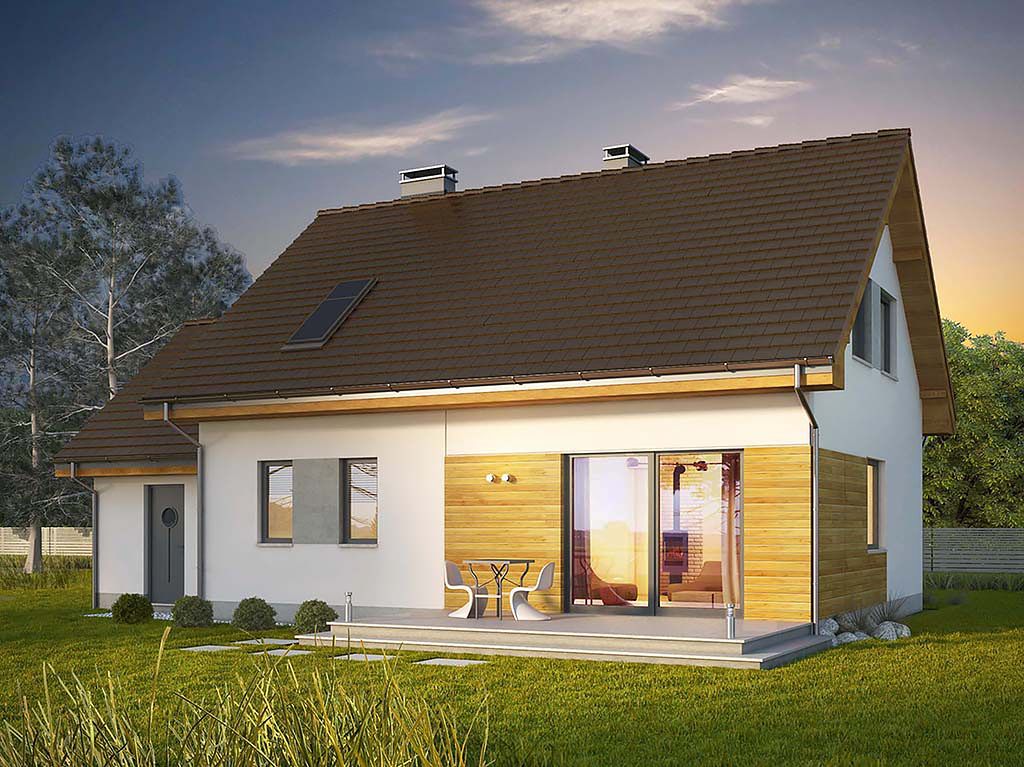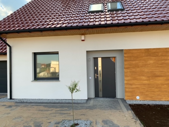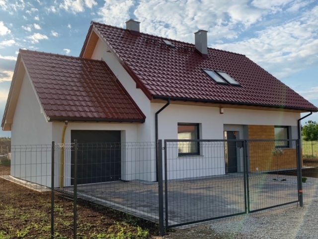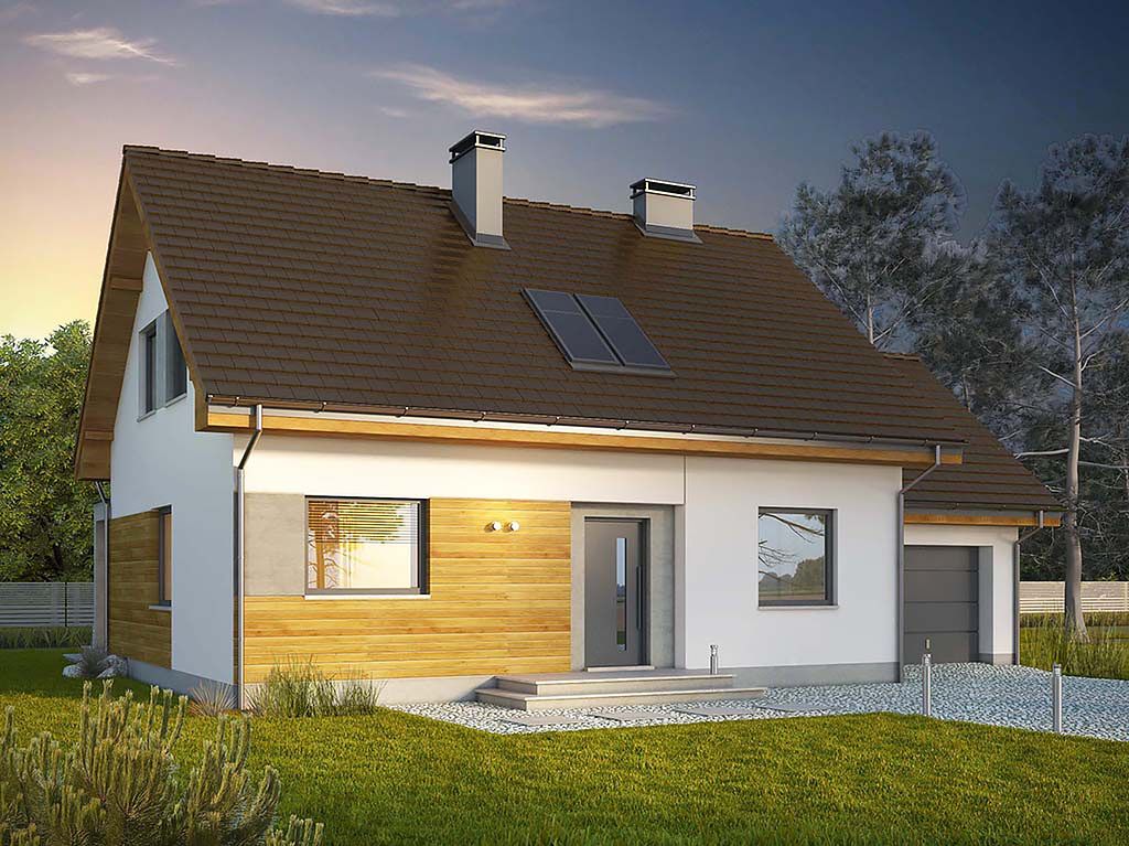 Średniej wielkości dom wolnostojący z garażem jednostanowiskowym wybudowany wg projektu Toffi ( 125,40 m², z garażem 144,70m²; 164 m² po podłodze) EXTRADOM ( 125,40 m², z garażem 144,70 m² ; 164 m² po podłodze)