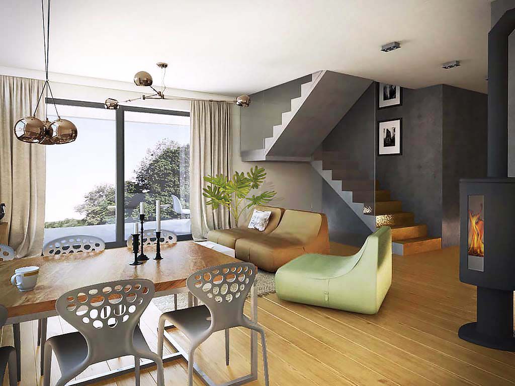 Wnętrze oferuje na parterze pokój dzienny z otwartą kuchnią o powierzchni 35 m2 ( projekt daje możliwość wydzielenia osobnej kuchni), gabinet, łazienkę i pomieszczenia gospodarcze oraz garaż. Na piętrze trzy sypialnie, jedna z garderobą oraz duża łazienka.
